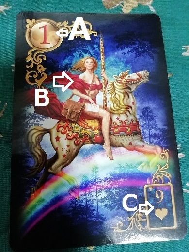 カードにもよりますが、大部分のルノルマンカードには(数字)(絵柄)(トランプ)が表記されています。